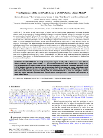 Diamond, R., Schroeder, D. orcid id iconORCID: https://orcid.org/0000-0003-2351-4306, Sime, L. C., Ridley, J. and Feltham, D. orcid id iconORCID: https://orcid.org/0000-0003-2289-014X (2024) The significance of the melt-pond scheme in a CMIP6 global climate model. Journal of Climate, 37 (1). pp. 249-268. ISSN 1520-0442 doi: 10.1175/jcli-d-22-0902.1