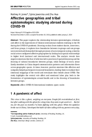 This paper explores the relationship between epistemologies, tribalism and affect in the experiences of Chinese international students studying in the UK during the COVID-19 pandemic. Drawing on data from student diaries, interviews, and focus groups, it explores how how boundaries between in-groups and out-groups were erected and dismantled through processes of socio-temporal scaling, whereby social actors configured affective geographies by linking local spatial relationships to higher level (national and international) scales. The analysis reveals how negative emotions like fear of infection led to practices of spatial distancing and the drawing of cultural boundaries between groups, while feelings of worry about family members in China shaped communication patterns and information flows across geographic spaces. At times, however, positive emotions like affection and sympathy helped participants transcend boundaries, leading them to readjust their emotional mappings of the world and reevaluate their beliefs about COVID. The study highlights the central role of affect and emotional labor play both in the formulation of epistemologies around health and in the drawing of boundaries between groups.