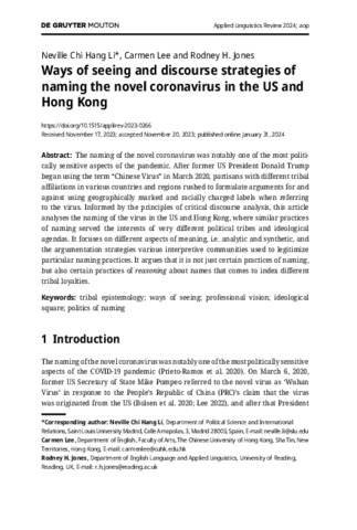 Li, N. C. H., Lee, C. and Jones, R. H. orcid id iconORCID: https://orcid.org/0000-0002-9426-727X (2024) Ways of seeing and discourse strategies of naming the novel coronavirus in the US and Hong Kong. Applied Linguistics Review. ISSN 1868-6311 doi: 10.1515/applirev-2023-0266
