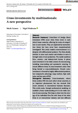 Casson, M. orcid id iconORCID: https://orcid.org/0000-0003-2907-6538 and Wadeson, N. orcid id iconORCID: https://orcid.org/0000-0001-8140-9307 (2024) Cross-investments by multinationals: a new perspective. Global Strategy Journal, 14 (2). pp. 279-311. ISSN 2042-5805 doi: 10.1002/gsj.1499