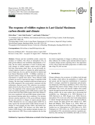 The response of wildfire regimes to Last Glacial Maximum carbon dioxide and climate.