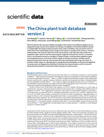 Plant functional traits represent adaptive strategies to the environment, linked to biophysical and biogeochemical processes and ecosystem functioning. Compilations of trait data facilitate research in multiple felds from plant ecology through to land-surface modelling. Here we present version 2 of the China Plant Trait Database, which contains information on morphometric, physical, chemical, photosynthetic and hydraulic traits from 1529 unique species in 140 sites spanning a diversity of vegetation types. Version 2 has fve improvements compared to the previous version: (1) new data from a 4-km elevation transect on the edge of Tibetan Plateau, including alpine vegetation types not sampled previously; (2) inclusion of traits related to hydraulic processes, including specifc sapwood conductance, the area ratio of sapwood to leaf, wood density and turgor loss point; (3) inclusion of information on soil properties to complement the existing data on climate and vegetation (4) assessments and fagging the reliability of individual trait measurements; and (5) inclusion of standardized templates for systematical feld sampling and measurements.