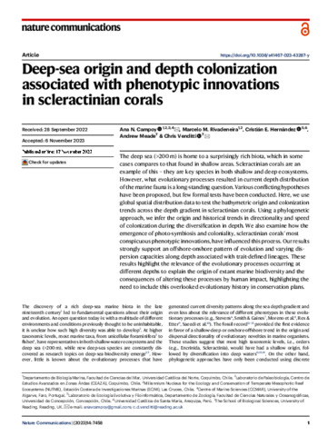 Campoy, A. N. orcid id iconORCID: https://orcid.org/0000-0002-6434-4326, Rivadeneira, M. M., Hernández, C. E. orcid id iconORCID: https://orcid.org/0000-0002-9811-2881, Meade, A. orcid id iconORCID: https://orcid.org/0000-0001-7095-7711 and Venditti, C. orcid id iconORCID: https://orcid.org/0000-0002-6776-2355 (2023) Deep-sea origin and depth colonization associated with phenotypic innovations in scleractinian corals. Nature Communications, 14. 7458. ISSN 2041-1723 doi: 10.1038/s41467-023-43287-y