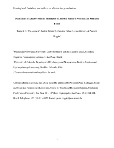 Wingenbach, T. S. H. orcid id iconORCID: https://orcid.org/0000-0002-1727-2374, Ribeiro, B., Nakao, C., Gruber, J. and Boggio, P. S. (2021) Evaluations of affective stimuli modulated by another person's presence and affiliative touch. Emotion, 21 (2). pp. 360-375. ISSN 1931-1516 doi: 10.1037/emo0000700