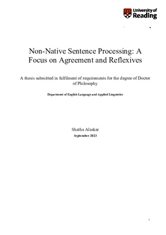Alaskar, S. (2023) Non-native sentence processing: a focus on agreement and reflexives. PhD thesis, University of Reading. doi: 10.48683/1926.00114302
