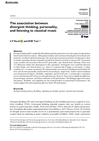 Divergent thinking (DT) enables flexible thinking and the generation of a wider range of original ideas that form the basis of creativity. Although personality traits and music listening have been found to be positively correlated with DT performance, the association remains inconclusive. Furthermore, there is a debate regarding whether originality should be included as an index to measure DT. The present study examines the association between DT, personality, and classical music listening. There were 162 Malaysian adults who participated in this experiment. Participants were randomly allocated to either happy, sad classical music (i.e., listen to a repeated clip of happy or sad music), or silent conditions (i.e., no music was played). DT and personality were assessed with Figural and Realistic DT Tests and 44-item personality model with five broad factors, respectively. Positive intercorrelations were found between fluency, flexibility, originality, and DT total score. A weak positive correlation was revealed between DT total score and openness trait. However, there was no significant difference between happy, sad music, and silent conditions on DT performance. The findings support the notion that fluency, flexibility, and originality are the essential indices in measuring DT performance. The results suggest that open-minded people have better DT performance.