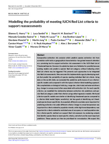 Henry, E. G., Santini, L., Butchart, S. H. M., González‐Suárez, M. orcid id iconORCID: https://orcid.org/0000-0001-5069-8900, Lucas, P. M., Benítez-López, A., Mancini, G., Jung, M., Cardoso, P., Zizka, A., Meyer, C., Akçakaya, H. R., Berryman, A. J., Cazalis, V. and Di Marco, M. (2024) Modelling the probability of meeting IUCN Red List criteria to support reassessments. Global Change Biology, 30 (1). e17119. ISSN 1365-2486 doi: 10.1111/gcb.17119