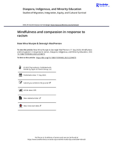 Munjee, R. M. and MacPherson, S. (2023) Mindfulness and compassion in response to racism. Diaspora, Indigenous, and Minority Education. ISSN 1559-5706 doi: 10.1080/15595692.2023.2254873