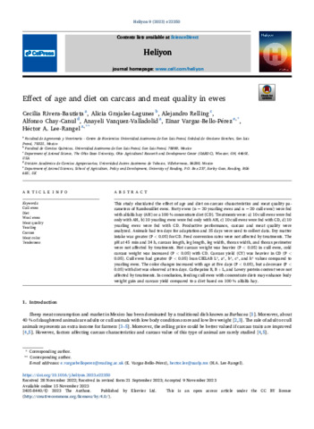 Rivera-Bautista, C., Grajales-Lagunes, A., Relling, A., Chay-Canul, A., Vazquez-Valladolid, A., Vargas-Bello-Pérez, E. orcid id iconORCID: https://orcid.org/0000-0001-7105-5752 and Lee-Rangel, H. A. (2023) Effect of age and diet on carcass and meat quality in ewes. Heliyon, 9 (11). e22350. ISSN 2405-8440 doi: 10.1016/j.heliyon.2023.e22350