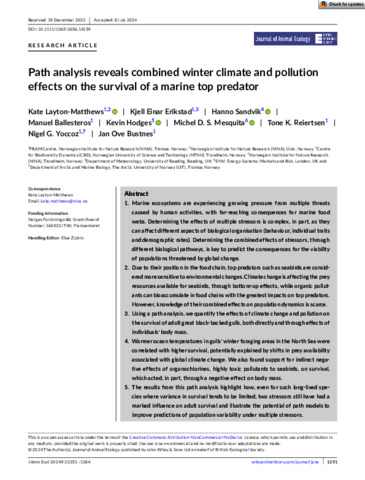 Marine ecosystems are experiencing growing pressure from multiple threats caused by human activities, with far-reaching consequences for marine food webs. Determining the effects of multiple stressors is complex, in part, as they can affect different levels of biological organisation (behaviour, individual traits, demographic rates). Knowledge of the cumulative effects of stressors is key to predict the consequences for threatened populations’ viability under global change. Due to their position in the food chain, top predators such as seabirds are considered more sensitive to environmental changes. Climate change is affecting the prey resources available for seabirds, through bottom-up effects, while organic pollutants can bioaccumulate in food chains with the greatest impacts on top predators. However, knowledge of their combined effects on seabird population dynamics is lacking. Using a path analysis, we quantify the effects of both climate change and pollution, via an effect on body mass, on the survival of adult great black-backed gulls. Warmer ocean temperatures in gulls’ winter foraging areas in the North Sea were correlated with higher survival, potentially explained by shifts in prey availability associated with global climate change. We also found support for indirect negative effects of organochlorines, highly toxic pollutants to seabirds, on survival acting through a negative effect on body mass. The results from this path analysis highlight how, even for such long-lived species where variance in survival tends to be limited, two stressors still have had a marked influence on adult survival and illustrate the potential of such models to improve predictions of population variability under multiple 36 stressors.