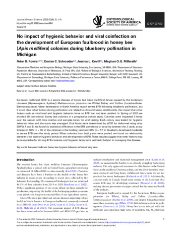 Fowler, P. D. orcid id iconORCID: https://orcid.org/0000-0002-4369-6007, Schroeder, D. C., Kevill, J. L. and Milbrath, M. O. G. (2023) No impact of hygienic behavior and viral coinfection on the development of European foulbrood in honey bee (Apis mellifera) colonies during blueberry pollination in Michigan. Journal of Insect Science, 23 (6). 21. ISSN 1536-2442 doi: 10.1093/jisesa/iead094