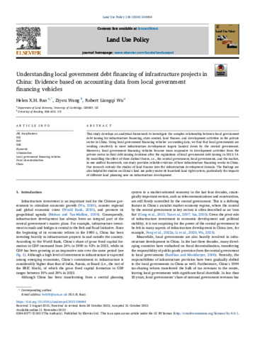 Bao, H. X.H., Wang, Z. orcid id iconORCID: https://orcid.org/0000-0003-0374-346X and Wu, R. L. (2024) Understanding local government debt financing of infrastructure projects in China: evidence based on accounting data from local government financing vehicles. Land Use Policy, 136. 106964. ISSN 0264-8377 doi: 10.1016/j.landusepol.2023.106964