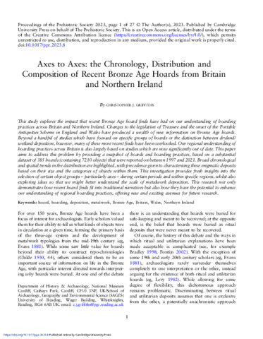 Griffiths, C. J. (2023) Axes to axes: the chronology, distribution and composition of recent bronze age hoards from Britain and Northern Ireland. Proceedings of the Prehistoric Society. ISSN 2050-2729 doi: 10.1017/ppr.2023.8