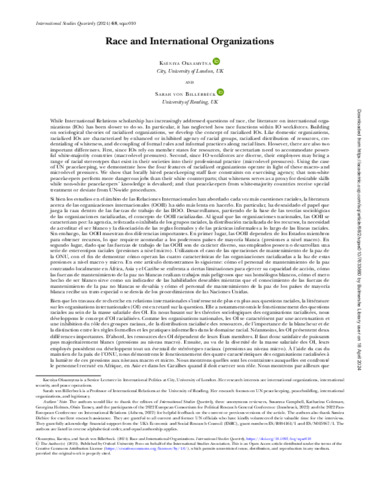While International Relations scholarship has increasingly addressed questions of race, the literature on international organizations (IOs) has been slower to do so. In particular, it has neglected how race functions within IO workforces. Building on sociological theories of racialized organizations, we develop the concept of racialized IOs. Like domestic organizations, IOs are characterized by enhanced or inhibited agency of racial groups, racialized distribution of resources, credentialing of whiteness, and decoupling of formal rules and informal practices along racial lines. However, IOs display two important differences. First, IOs rely on member states for resources, which requires accommodating powerful white-majority countries (macro-level pressures). Second, since IO workforces are diverse, their employees possess or develop a range of racial stereotypes (micro-level pressures). Using the case of UN peacekeeping, we demonstrate how the four features of racialized organizations operate in light of these macro- and micro-level pressures. We show how locally-hired peacekeeping staff in Africa, Asia, and the Caribbean face constraints on exercising agency; how non-white peacekeepers perform more dangerous jobs than their white counterparts; how whiteness serves as a proxy for desirable skills, while non-white peacekeepers’ knowledge is devalued; and how peacekeepers from white-majority countries receive special treatment or deviate from UN-wide procedures.