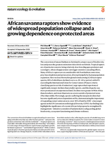Shaw, P., Ogada, D., Dunn, L., Buij, R., Amar, A., Garbett, R., Herremans, M., Virani, M. Z., Kendall, C. J., Croes, B. M., Odino, M., Kapila, S., Wairasho, P., Rutz, C., Botha, A., Gallo-Orsi, U., Murn, C. orcid id iconORCID: https://orcid.org/0000-0003-4064-6060, Maude, G. and Thomsett, S. (2024) African savanna raptors show evidence of widespread population collapse and a growing dependence on protected areas. Nature Ecology & Evolution, 8 (1). pp. 45-56. ISSN 2397-334X doi: 10.1038/s41559-023-02236-0