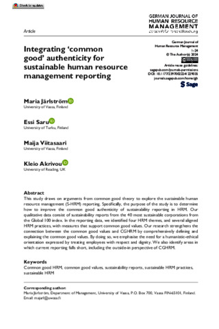 Järlström, M., Saru, E., Viitasaari, M. and Akrivou, K. orcid id iconORCID: https://orcid.org/0000-0003-2212-6280 (2024) Integrating ‘common good’ authenticity for sustainable human resource management (HRM) reporting. German Journal of Human Resource Management, 38 (2). pp. 159-182. ISSN 1862-0000 doi: 10.1177/23970022241229035