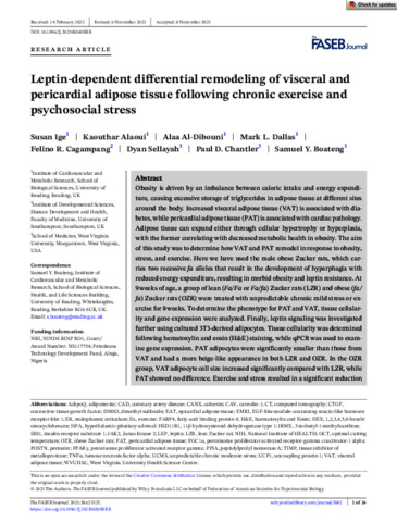 Ige, S., Alaoui, K., Al-Dibouni, A., Dallas, M. L. orcid id iconORCID: https://orcid.org/0000-0002-5190-0522, Cagampang, F. R., Sellayah, D., Chantler, P. D. and Boateng, S. Y. (2024) Leptin-dependent differential remodeling of visceral and pericardial adipose tissue following chronic exercise and psychosocial stress. The FASEB Journal, 38 (1). e23325. ISSN 1530-6860 doi: 10.1096/fj.202300269RRR
