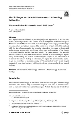 This paper considers the value of past and prospective applications of key environmental archaeological and earth science fields relating to the historical ecology of Mauritius and the Mascarene islands more broadly: palaeoecology, geoarchaeology, zooarchaeology and climate studies. The contribution of each sub-field is outlined with the aim of demonstrating the potential value of an integrated environmental archaeological approach for developing a long-term understanding of the human ecology of Mauritius and its associated islands. The paper considers the potential and limitations of existing approaches and data, as well as future challenges. Beyond solely reconstructing the nuances of anthropogenic impact on the environment in relation to the island’s history of settlement, we argue that environmental archaeology can contribute to an understanding of ‘biocultural diversity’ as an integral element of Mauritian heritage, bridging the divide between cultural and natural heritage.