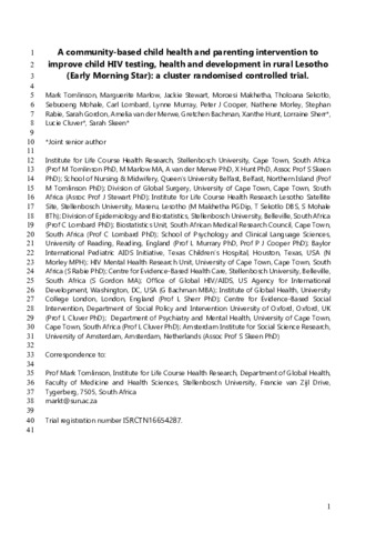 Tomlinson, M., Marlow, M., Stewart, J., Makhetha, M., Sekotlo, T., Mohale, S., Lombard, C., Murray, L., Cooper, P. J., Morley, N., Rabie, S., Gordon, S., van der Merwe, A., Bachman, G., Hunt, X., Sherr, L., Cluver, L. and Skeen, S. (2024) A community-based child health and parenting intervention to improve child HIV testing, health, and development in rural Lesotho (Early Morning Star): a cluster-randomised, controlled trial. The Lancet HIV, 11 (1). e42-e51. ISSN 2352-3018 doi: 10.1016/S2352-3018(23)00265-5