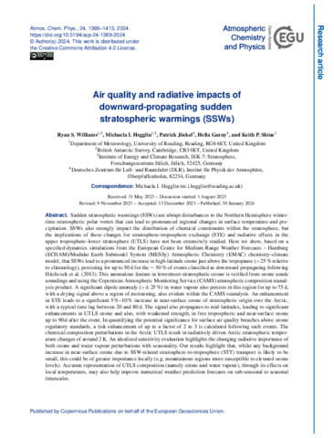 Williams, R. S., Hegglin, M. I. orcid id iconORCID: https://orcid.org/0000-0003-2820-9044, Jöckel, P., Garny, H. and Shine, K. P. orcid id iconORCID: https://orcid.org/0000-0003-2672-9978 (2024) Air quality and radiative impacts of downward-propagating sudden stratospheric warmings (SSWs). Atmospheric Chemistry and Physics, 24 (2). pp. 1389-1413. ISSN 1680-7324 doi: 10.5194/acp-24-1389-2024