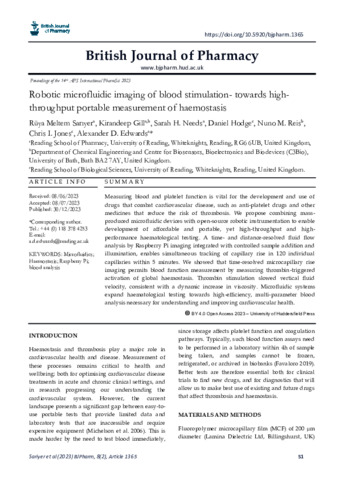 Sarıyer, R. M. orcid id iconORCID: https://orcid.org/0000-0002-2155-653X, Gill, K., Needs, S. H. orcid id iconORCID: https://orcid.org/0000-0003-3407-9637, Hodge, D., Reis, N. M., Jones, C. I. orcid id iconORCID: https://orcid.org/0000-0001-7537-1509 and Edwards, A. D. orcid id iconORCID: https://orcid.org/0000-0003-2369-989X (2023) Robotic microfluidic imaging of blood stimulation- towards high-throughput portable measurement of haemostasis. British Journal of Pharmacy, 8 (2). ISSN 2058-8356 doi: 10.5920/bjpharm.1365