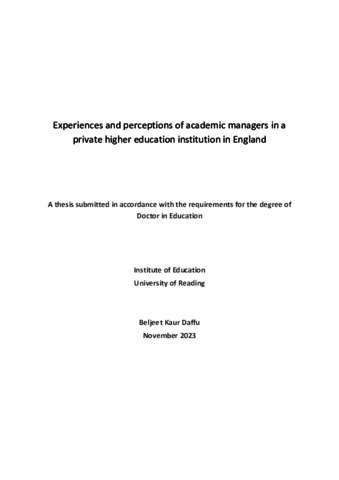 Daffu, B. K. (2023) Experiences and perceptions of academic managers in a private higher education institution in England. EdD thesis, University of Reading. doi: 10.48683/1926.00114665
