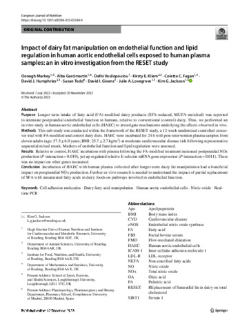 Markey, O., Garcimartín, A., Vasilopoulou, D., Kliem, K. E. orcid id iconORCID: https://orcid.org/0000-0002-0058-8225, Fagan, C. C. orcid id iconORCID: https://orcid.org/0000-0002-2101-8694, Humphries, D. J., Todd, S. orcid id iconORCID: https://orcid.org/0000-0002-9981-923X, Givens, D. I. orcid id iconORCID: https://orcid.org/0000-0002-6754-6935, Lovegrove, J. A. orcid id iconORCID: https://orcid.org/0000-0001-7633-9455 and Jackson, K. G. orcid id iconORCID: https://orcid.org/0000-0002-0070-3203 (2023) Impact of dairy fat manipulation on endothelial function and lipid regulation in human aortic endothelial cells exposed to human plasma samples: an in vitro investigation from the RESET study. European Journal of Nutrition. ISSN 1436-6215 doi: 10.1007/s00394-023-03284-9