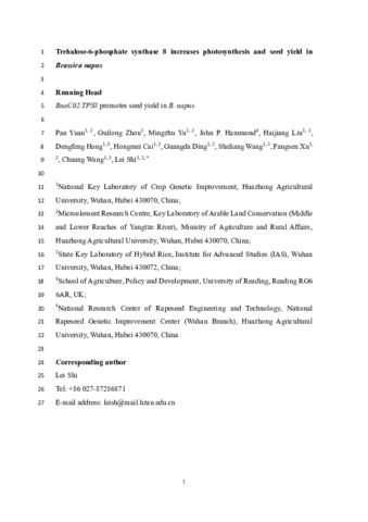 Trehalose‐6‐phosphate synthase 8 increases photosynthesis and seed yield in Brassica napus.