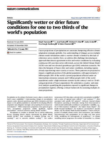 Trancoso, R. orcid id iconORCID: https://orcid.org/0000-0002-9697-7005, Syktus, J. orcid id iconORCID: https://orcid.org/0000-0003-1782-3073, Allan, R. P. orcid id iconORCID: https://orcid.org/0000-0003-0264-9447, Croke, J. orcid id iconORCID: https://orcid.org/0000-0002-1707-0377, Hoegh-Guldberg, O. orcid id iconORCID: https://orcid.org/0000-0001-7510-6713 and Chadwick, R. orcid id iconORCID: https://orcid.org/0000-0001-6767-5414 (2024) Significantly wetter or drier future conditions for one to two thirds of the world’s population. Nature Communications, 15 (1). 483. ISSN 2041-1723 doi: 10.1038/s41467-023-44513-3