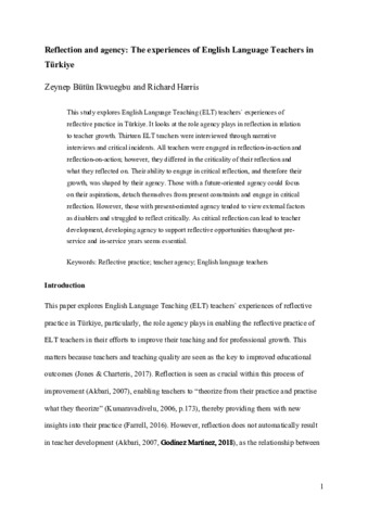 Bütün Ikwuegbu, Z. and Harris, R. orcid id iconORCID: https://orcid.org/0000-0001-8606-5515 (2024) Reflection and agency: the experiences of English Language Teachers in Türkiye. Reflective Practice, 25 (2). pp. 101-116. ISSN 1470-1103 doi: 10.1080/14623943.2024.2304849