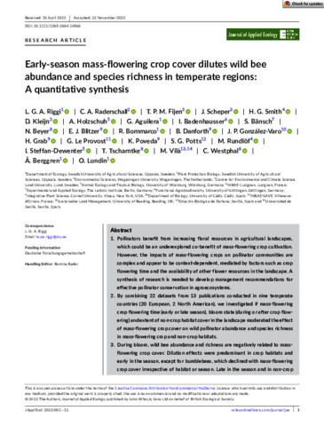 Riggi, L. G. A. orcid id iconORCID: https://orcid.org/0000-0002-7236-3877, Raderschall, C. A. orcid id iconORCID: https://orcid.org/0000-0003-2005-1705, Fijen, T. P. M. orcid id iconORCID: https://orcid.org/0000-0002-4371-2708, Scheper, J. orcid id iconORCID: https://orcid.org/0000-0002-4314-996X, Smith, H. G. orcid id iconORCID: https://orcid.org/0000-0002-2289-889X, Kleijn, D. orcid id iconORCID: https://orcid.org/0000-0003-2500-7164, Holzschuh, A. orcid id iconORCID: https://orcid.org/0000-0002-5235-4746, Aguilera, G. orcid id iconORCID: https://orcid.org/0000-0001-9166-1100, Badenhausser, I. orcid id iconORCID: https://orcid.org/0000-0002-6919-8647, Bänsch, S., Beyer, N. orcid id iconORCID: https://orcid.org/0000-0001-7466-5759, Blitzer, E. J. orcid id iconORCID: https://orcid.org/0000-0002-6606-1741, Bommarco, R. orcid id iconORCID: https://orcid.org/0000-0001-8888-0476, Danforth, B. orcid id iconORCID: https://orcid.org/0000-0002-6495-428X, González‐Varo, J. P. orcid id iconORCID: https://orcid.org/0000-0003-1439-6475, Grab, H. orcid id iconORCID: https://orcid.org/0000-0002-1073-8805, Le Provost, G. orcid id iconORCID: https://orcid.org/0000-0002-1643-6023, Poveda, K., Potts, S. G. orcid id iconORCID: https://orcid.org/0000-0002-2045-980X, Rundlöf, M. orcid id iconORCID: https://orcid.org/0000-0003-3014-1544, Steffan‐Dewenter, I. orcid id iconORCID: https://orcid.org/0000-0003-1359-3944, Tscharntke, T. orcid id iconORCID: https://orcid.org/0000-0002-4482-3178, Vilà, M., Westphal, C. orcid id iconORCID: https://orcid.org/0000-0002-2615-1339, Berggren, Å. orcid id iconORCID: https://orcid.org/0000-0002-4998-5723 and Lundin, O. orcid id iconORCID: https://orcid.org/0000-0002-5948-0761 (2023) Early‐season mass‐flowering crop cover dilutes wild bee abundance and species richness in temperate regions: A quantitative synthesis. Journal of Applied Ecology. ISSN 1365-2664 doi: 10.1111/1365-2664.14566