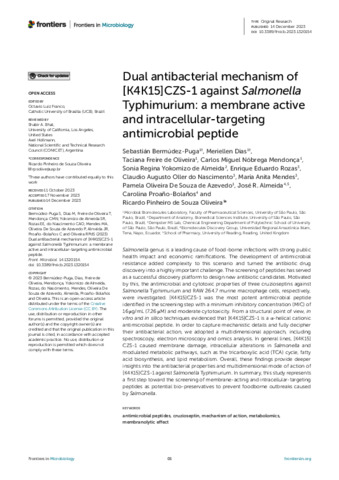 Dual antibacterial mechanism of [K4K15]CZS-1 against Salmonella Typhimurium: a membrane active and intracellular-targeting antimicrobial peptide.