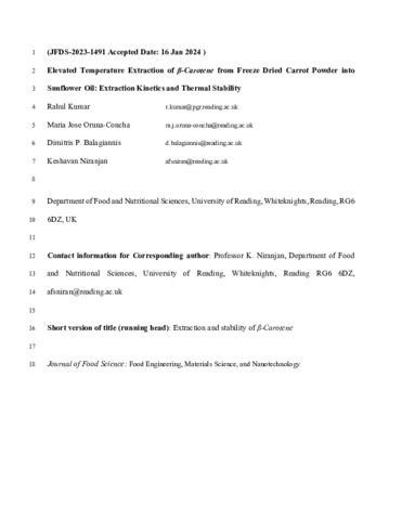 Elevated temperature extraction of β-Carotene from freeze dried carrot powder into sunflower oil: extraction kinetics and thermal stability.