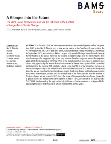 Kuhlbrodt, T. orcid id iconORCID: https://orcid.org/0000-0003-2328-6729, Swaminathan, R. orcid id iconORCID: https://orcid.org/0000-0001-5853-2673, Ceppi, P. and Wilder, T. orcid id iconORCID: https://orcid.org/0000-0002-1108-4655 (2024) A glimpse into the future: the 2023 ocean temperature and sea-ice extremes in the context of longer-term climate change. Bulletin of the American Meteorological Society, 105 (3). E474-E485. ISSN 1520-0477 doi: 10.1175/BAMS-D-23-0209.1