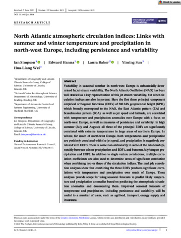 North Atlantic atmospheric circulation indices: links with summer and winter temperature and precipitation in north-west Europe, including persistence and variability.