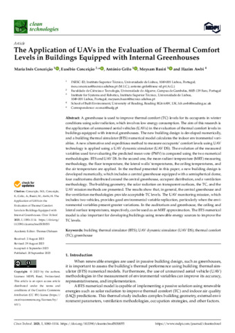 Conceição, M. I. orcid id iconORCID: https://orcid.org/0000-0001-5322-8875, Conceição, E. orcid id iconORCID: https://orcid.org/0000-0001-5963-2107, Grilo, A. orcid id iconORCID: https://orcid.org/0000-0002-3806-0055, Basiri, M. orcid id iconORCID: https://orcid.org/0000-0002-8456-6284 and Awbi, H. (2023) The application of UAVs in the evaluation of thermal comfort levels in buildings equipped with internal greenhouses. Clean Technologies, 5 (3). pp. 1080-1114. ISSN 2571-8797 doi: 10.3390/cleantechnol5030055