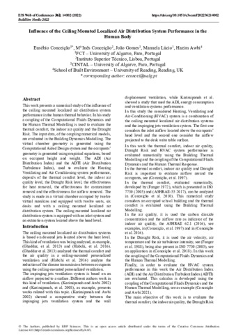 Conceição, E., Conceição, M. I., Gomes, J., Lúcio, M. and Awbi, H. (2022) Influence of the ceiling mounted localized air distribution system performance in the human body. E3S Web of Conferences, 362. 14002. ISSN 2267-1242 doi: 10.1051/e3sconf/202236214002