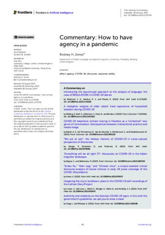 This commentary interrogates the way agency was conceived of during the COVID-19 pandemic through three different frameworks: a linguistic framework that focuses on how agency is encoded in and enacted through language, a framework based on practice theory that focuses on how agency emerges through social interactions, and a framework informed by post-human and new materialist perspectives that sees agency as performed within networks of human and non-human actors. It ends by arguing that, while all of these perspectives provide insights into how language shapes agency, they do not provide an adequate roadmap for how to understand and enact agency in a global crisis such as a pandemic. For this, it is argued, a new perspective on agency is needed, one which focuses more on collective action, generosity, and learning to respond to others.