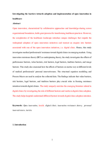 Investigating the barriers towards adoption and implementation of open innovation in healthcare.