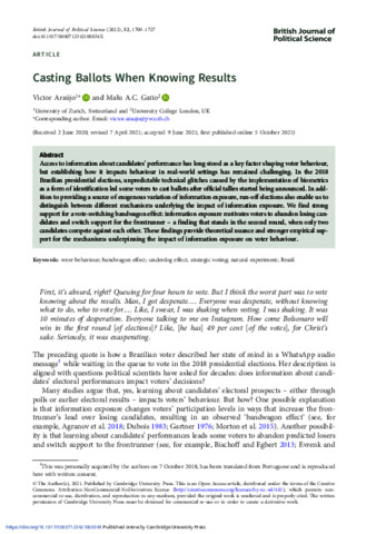 Access to information about candidates' performance has long stood as a key factor shaping voter behaviour, but establishing how it impacts behaviour in real-world settings has remained challenging. In the 2018 Brazilian presidential elections, unpredictable technical glitches caused by the implementation of biometrics as a form of identification led some voters to cast ballots after official tallies started being announced. In addition to providing a source of exogenous variation of information exposure, run-off elections also enable us to distinguish between different mechanisms underlying the impact of information exposure. We find strong support for a vote-switching bandwagon effect: information exposure motivates voters to abandon losing candidates and switch support for the frontrunner – a finding that stands in the second round, when only two candidates compete against each other. These findings provide theoretical nuance and stronger empirical support for the mechanisms underpinning the impact of information exposure on voter behaviour.