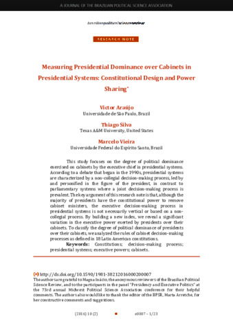 Measuring presidential dominance over cabinets in presidential systems: constitutional design and power sharing.