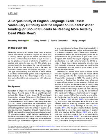 A corpus study of English language exam texts: vocabulary difficulty and the impact on students’ wider reading (or should students be reading more texts by dead white men?).