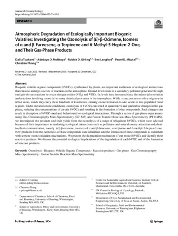 Atmospheric degradation of ecologically important biogenic volatiles: investigating the ozonolysis of (E)-β-ocimene, isomers of α and β-farnesene, α-terpinene and 6-methyl-5-hepten-2-one, and their gas-phase products.