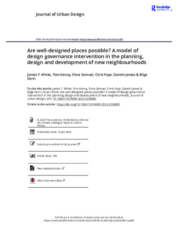 White, J. T. orcid id iconORCID: https://orcid.org/0000-0002-6315-3165, Kenny, T. orcid id iconORCID: https://orcid.org/0000-0001-8038-5884, Samuel, F. orcid id iconORCID: https://orcid.org/0000-0001-9243-3118, Foye, C. orcid id iconORCID: https://orcid.org/0000-0001-7880-2714, James, G. orcid id iconORCID: https://orcid.org/0000-0002-6856-6188 and Serin, B. orcid id iconORCID: https://orcid.org/0000-0002-3005-0549 (2024) Are well-designed places possible? A model of design governance intervention in the planning, design and development of new neighbourhoods. Journal of Urban Design. ISSN 1469-9664 doi: 10.1080/13574809.2023.2296885