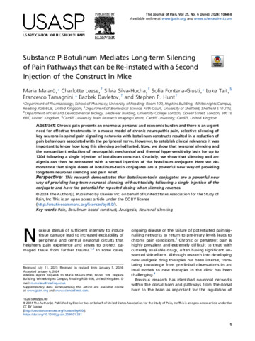 Maiarù, M. orcid id iconORCID: https://orcid.org/0000-0003-0927-6567, Leese, C., Silva-Hucha, S., Fontana-Giusti, S., Tait, L., Tamagnini, F. orcid id iconORCID: https://orcid.org/0000-0002-8741-5094, Davletov, B. and Hunt, S. P. (2024) Substance P-Botulinum mediates long-term silencing of pain pathways that can be re-instated with a second injection of the construct in mice. The Journal of Pain, 25 (6). 104466. ISSN 1526-5900 doi: 10.1016/j.jpain.2024.01.331