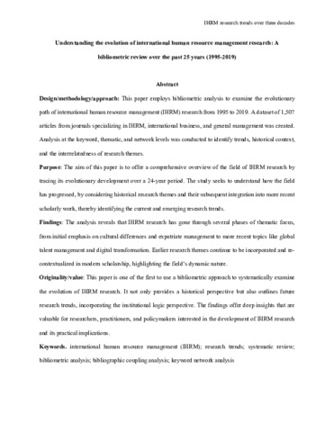Design/methodology/approach: This paper employs bibliometric analysis to examine the evolutionary path of international human resource management (IHRM) research from 1995 to 2019. A dataset of 1,507 articles from journals specializing in IHRM, international business, and general management was created. Analysis at the keyword, thematic, and network levels was conducted to identify trends, historical context, and the interrelatedness of research themes. Purpose: The aim of this paper is to offer a comprehensive overview of the field of IHRM research by tracing its evolutionary development over a 24-year period. The study seeks to understand how the field has progressed, by considering historical research themes and their subsequent integration into more recent scholarly work, thereby identifying the current and emerging research trends. Findings: The analysis reveals that IHRM research has gone through several phases of thematic focus, from initial emphasis on cultural differences and expatriate management to more recent topics like global talent management and digital transformation. Earlier research themes continue to be incorporated and re-contextualized in modern scholarship, highlighting the field’s dynamic nature. Originality/value: This paper is one of the first to use a bibliometric approach to systematically examine the evolution of IHRM research. It not only provides a historical perspective but also outlines future research trends, incorporating the institutional logic perspective. The findings offer deep insights that are valuable for researchers, practitioners, and policymakers interested in the development of IHRM research and its practical implications.