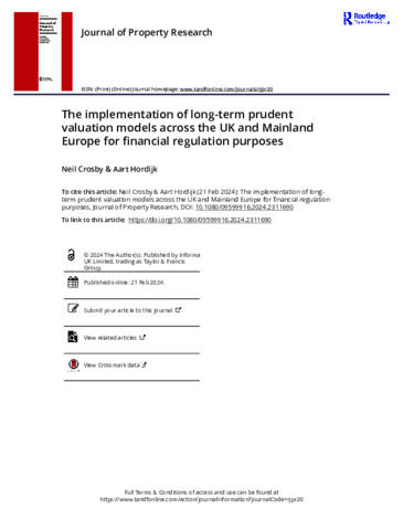 Crosby, N. and Hordijk, A. (2024) The implementation of long-term prudent valuation models across the UK and Mainland Europe for financial regulation purposes. Journal of Property Research. ISSN 1466-4453 doi: 10.1080/09599916.2024.2311690