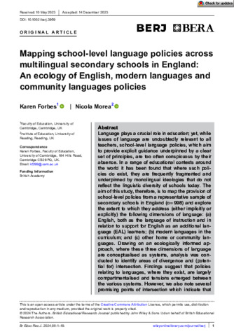 Forbes, K. orcid id iconORCID: https://orcid.org/0000-0001-8981-8236 and Morea, N. orcid id iconORCID: https://orcid.org/0000-0003-0623-3078 (2024) Mapping school‐level language policies across multilingual secondary schools in England: an ecology of English, modern languages and community languages policies. British Educational Research Journal. ISSN 1469-3518 doi: 10.1002/berj.3959