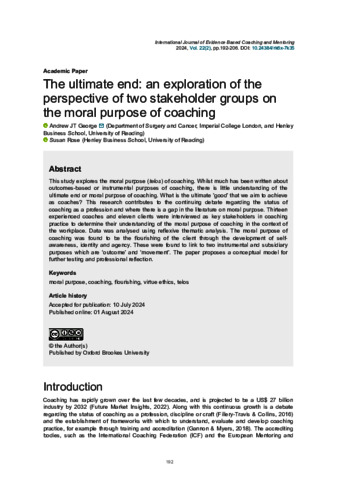 This study explores the moral purpose (telos) of coaching. Whilst much has been written about outcomes-based or instrumental purposes of coaching, there is little understanding of the ultimate end or moral purpose of coaching. What is the ultimate ‘good’ that we aim to achieve as coaches? This research contributes to the continuing debate regarding the status of coaching as a profession and where there is a gap in the literature on moral purpose. Thirteen experienced coaches and eleven clients were interviewed as key stakeholders in coaching practice to determine their understanding of the moral purpose of coaching in the context of the workplace. Data was analysed using reflexive thematic analysis. The moral purpose of coaching was found to be the flourishing of the client through the development of self-awareness, identity and agency. These were found to link to two instrumental and subsidiary purposes which are ‘outcome’ and ‘movement’. The paper proposes a conceptual model for further testing and professional reflection.