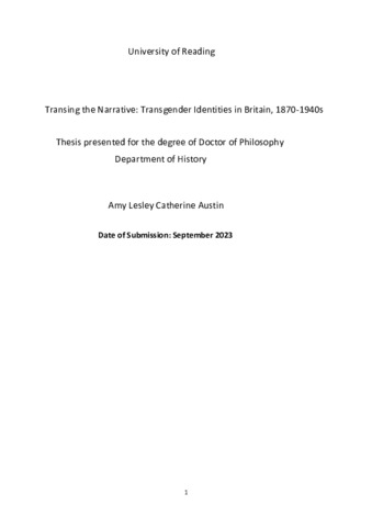Austin, A. L. C. (2024) Transing the narrative: transgender identities in Britain, 1870-1940s. PhD thesis, University of Reading. doi: 10.48683/1926.00115173
